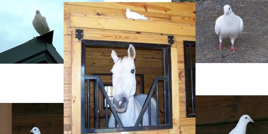 We called the bird Paloma Blanca, Spanish for “white pigeon” and she became part of our herd. She enjoyed breakfast and dinner with the horses and slept with them in the barn. At feeding time, she would walk up and down the barn aisle with me making small muttering sounds, kind of like a daily commentary. Our barn staff loved her and referred to her as “mi amiga Paloma Blanca.”